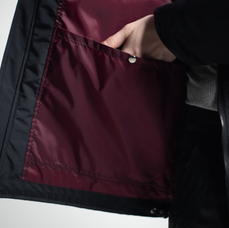 Mens lined and insulated Ski Jacket with 3-piece hooded collar, center front zip closure, front yoke paneling. Front slanted zip pockets w/ pocket flap and snap closure. Curved sleeve cuffs w/ hidden elastic cuff, back yoke paneling, inner storm guard, and lining pockets w/ snap closures and adjustable cinch hem.